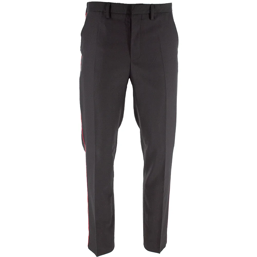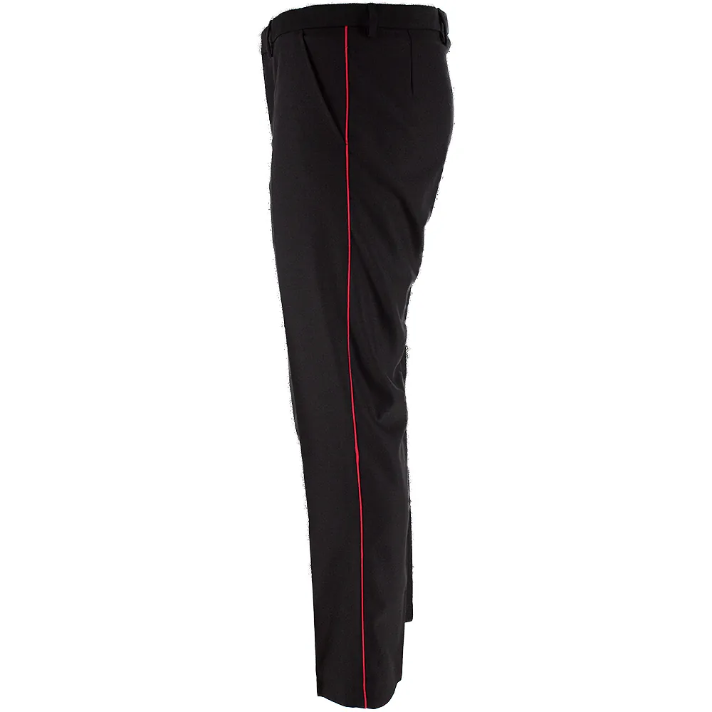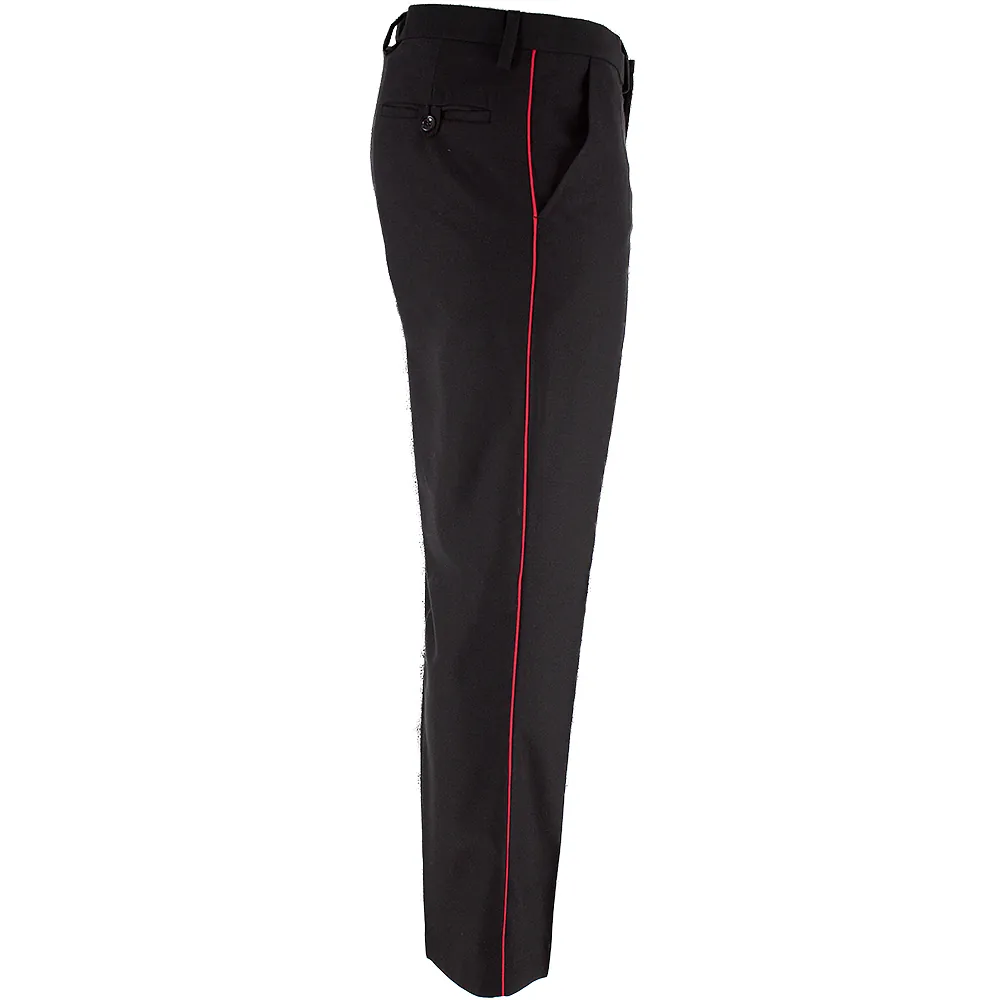 Ausstattung: • 6 Gürtelschlaufen am Hosenbund • Hosenschlitz mit Reißverschluss und am Bund mit Haken und Knopf verschließbar • 2 Seitentaschen • Rechts hinten ist 1 eingeschnittene Gesäßtasche mit Knopf verschließbar • Roter Passepoil in der Seitennaht