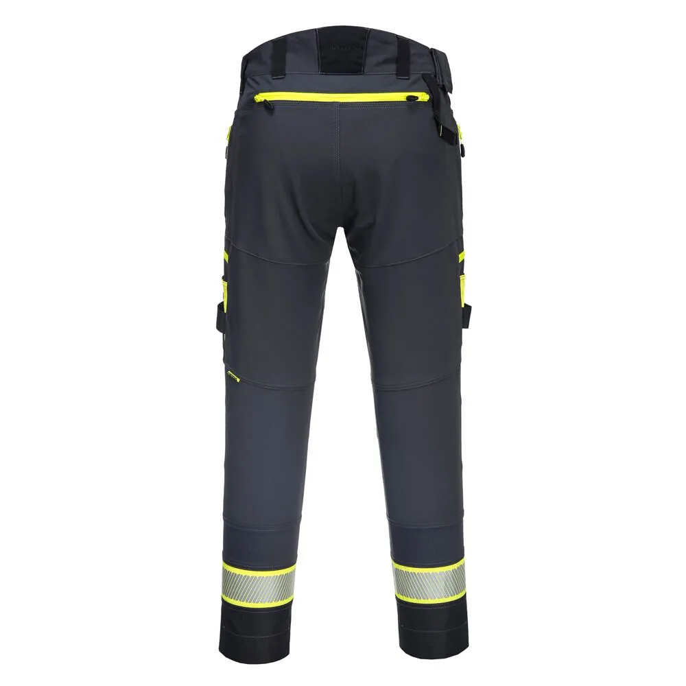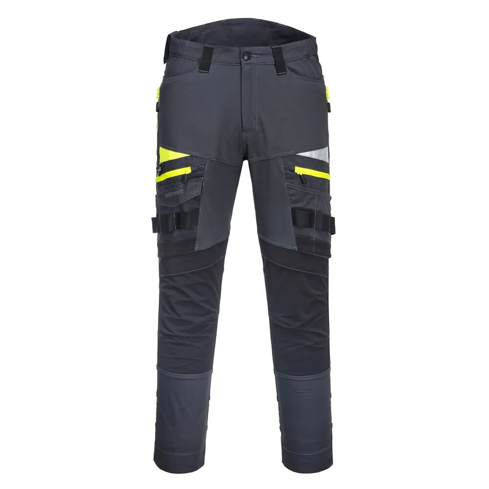 Die DX4 Arbeitshose ist ergonomisch gestaltet und nutzt die gezielte Platzierung von dynamischen 4X-Stretch-Geweben, um maximale Bewegungsfreiheit bei der Arbeit zu gewährleisten. Die Hose verfügt über einen hochgezogenen Rückenbund mit seitlichem Gummizug, der Schutz in allen Arbeitspositionen bietet. Vorgeformte, von oben zu beladende, verstellbare Kniepolstertaschen, großzügig bemessene Vordertaschen und multifunktionale Oberschenkeltaschen mit Reißverschluss bieten sicheren Stauraum für Telefon, Stifte und Werkzeug. Dreifachnähte für maximale Haltbarkeit.